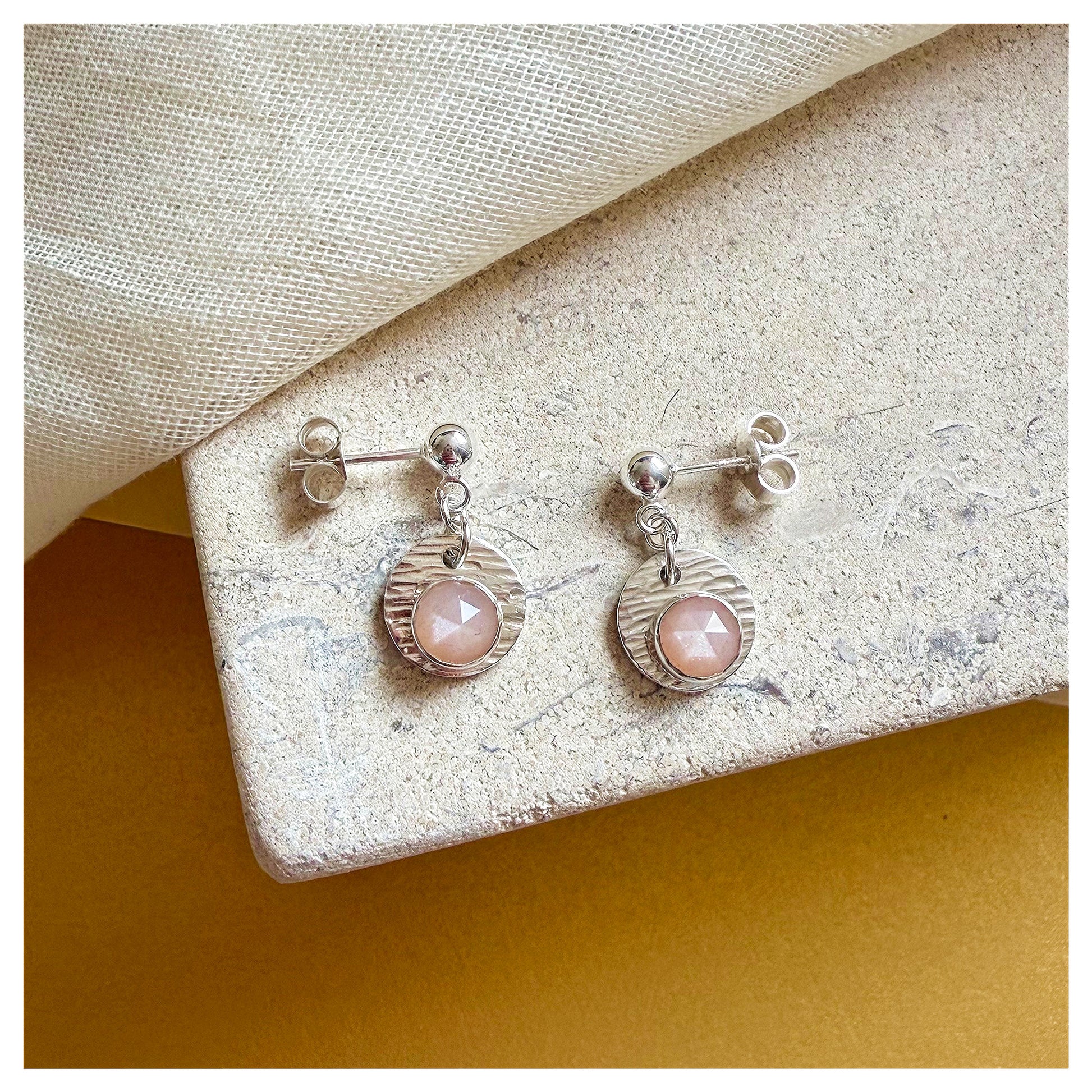 Sterling Silver Textured Peach Moonstone Gemstone Drop Earrings.